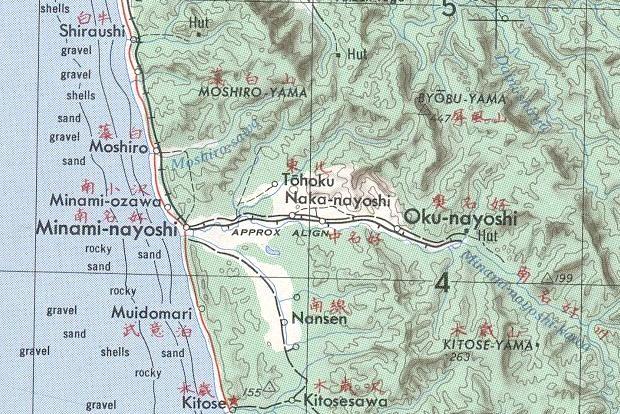 в 1986 году (нанесена условно, на основе данных предыдущей карты). Узкоколейная железная дорога предназначалась для вывоза угля из шахты вблизи Найоси к причалу на берегу Татарского пролива. Протяжённость узкоколейной железной дороги составляла около 3 километров. Ориентировочный период постройки — 1920-е годы.