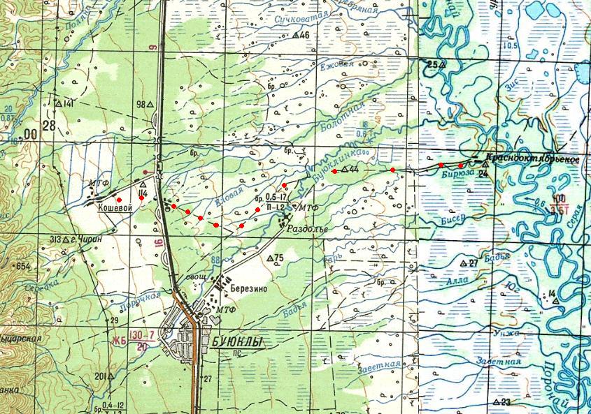 Участок маршрута насыпь ж/д. Расстояние 2100 м. Азимут движения 700-750. Время в пути 45 минут. Насыпь узкоколейной ж/д проложена по левому склону распадка, перепады высот по насыпи незначительные. По центральной части насыпи тропинка, на насыпи травянистая растительность местами высокая и густая. Местами попадаются рельсы и шпалы от ж/д., ширина головки рельса 4,5 см. Постепенно происходит уменьшение высоты насыпи, через 1050 м на насыпь справа по ходу движения выходит давно пробитая лесовозная дорога.