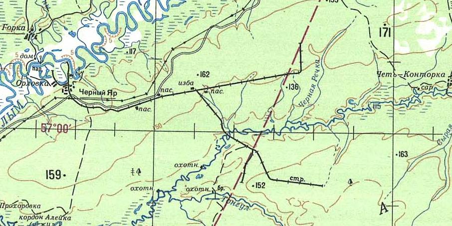 на топографической карте масштаба 1:200 000, изданной в 1988 году. Вблизи села Нарым предполагалось строительство лесовозной узкоколейной железной дороги. По информации от исследователя железных дорог С. Костыгова, полученной им в ходе поездки в Томскую область в декабре 2004 года, в начале 1980-х годов водным путём сюда был завезён тепловоз, материалы верхнего строения пути (рельсы). В результате чьей-то халатности тепловоз был оставлен слишком близко от реки, во время весеннего паводка он был затоплен и пришёл в негодность. Из-за этого строительство узкоколейной железной дороги было отложено. Позднее от него окончательно отказались.