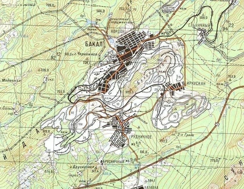 Узкоколейная железная дорога (?) на топографической карте масштаба 1:100 000, изданной в 1990 году. Город Бакал является центром добычи железной руды. Руда добывается как открытым способом — в карьерах, так и подземным способом — в шахте «Сидеритовая».