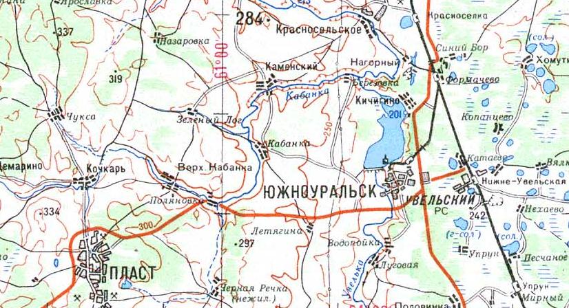 Район местонахождения узкоколейной железной дороги на топографической карте масштаба 1:100 000,