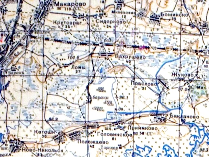 изданной в 198? году (обозначена разобранной, обозначена не полностью). Узкоколейная железная дорога на топографической карте масштаба 1:100 000, изданной в 198? году (обозначена разобранной, обозначена не полностью)
