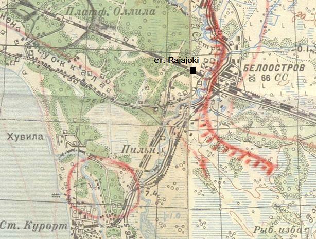 Узкоколейная железная дорога в окрестностях станции Раяйоки. Начальный пункт — станция Раяйоки (Rajajoki), находившаяся на железнодорожной линии Белоостров — Зеленогорск.