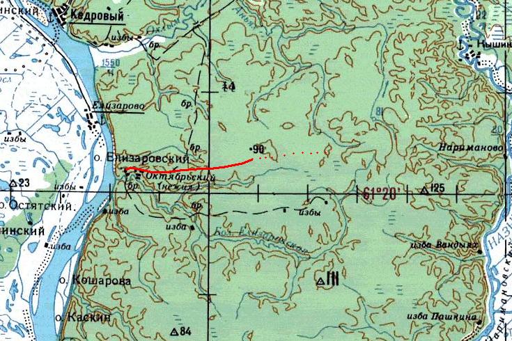 Елизаровская (?) узкоколейная железная дорога. Начальный пункт — посёлок Октябрьский, расположенный на правом берегу реки Большая Елизаровская.