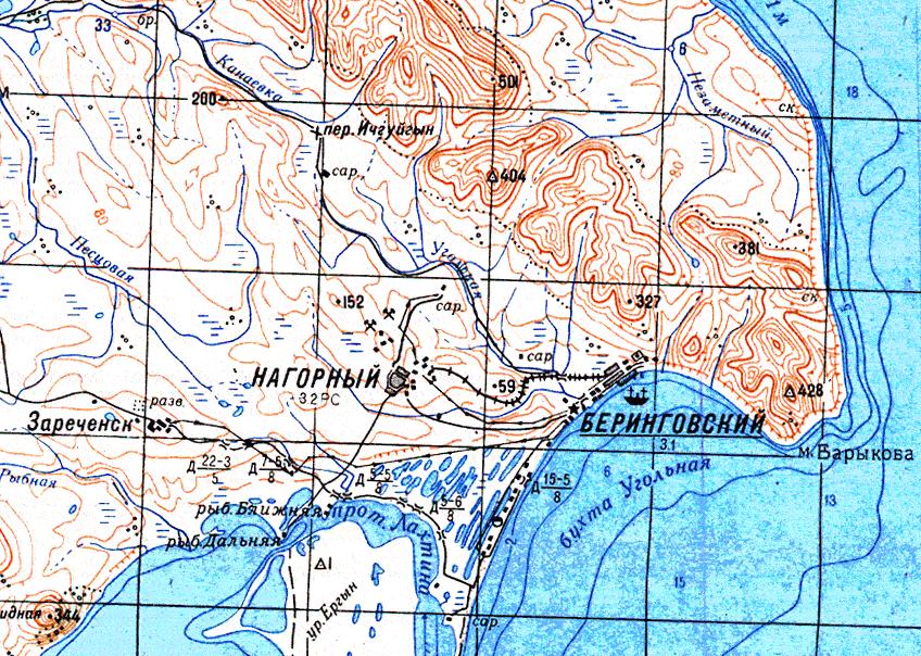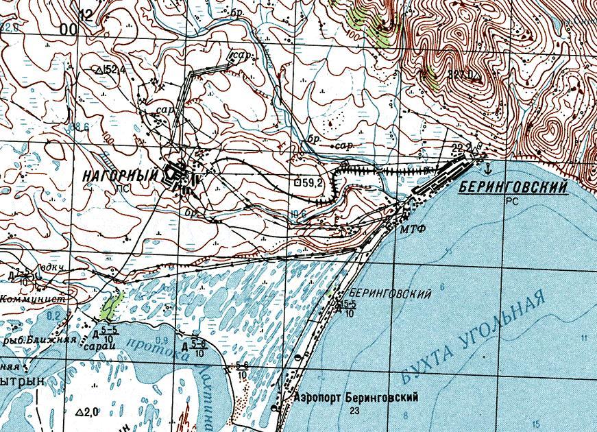 Узкоколейная железная дорога на топографической карте масштаба 1:100 000, изданной в 1977 году. Узкоколейная железная дорога Беринговский — Нагорный соединяла шахту в посёлке Нагорный с морским портом в посёлке Беринговский.