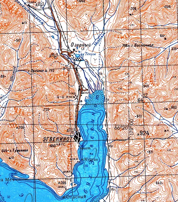 на топографической карте масштаба 1:200 000. Посёлок Эгвекинот в 1949-1956 годах являлся центром «Чукотстройлага». Здесь был построен порт и некоторые промышленные предприятия. По воспоминаниям бывших жителей посёлка, до конца 1960-х годов (?) имелась узкоколейная железная дорога, прицепной подвижной состав которой состоял из вагонеток. Она служила для вывоза грузов из порта.