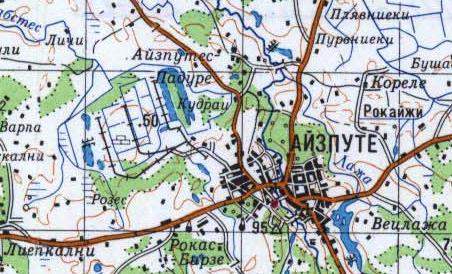 Узкоколейная железная дорога на топографической карте. По состоянию на 2005 год, узкоколейная железная дорога действует. Участок Даугули — Пуйкуле разобран (?).