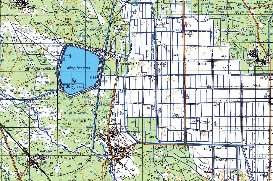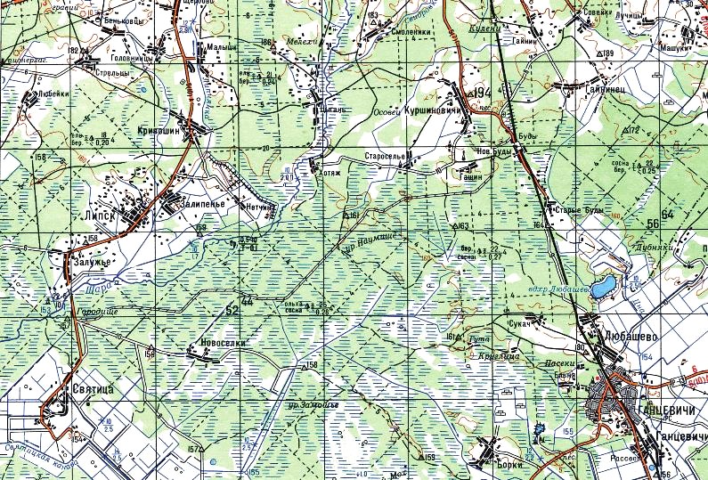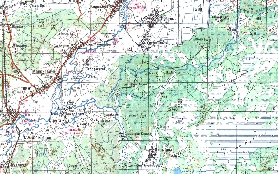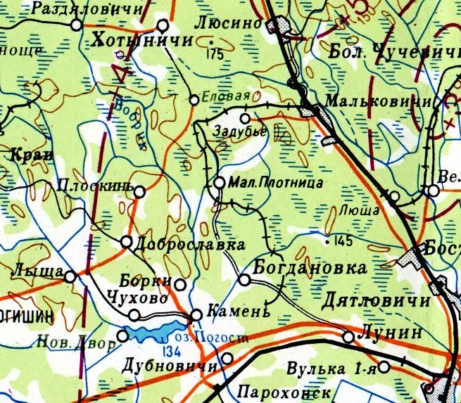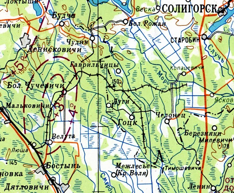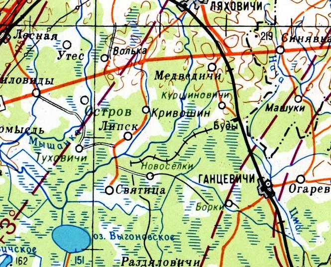 Показаны только окрестности станции Люща. Одна из крупнейших лесовозных узкоколейных железных дорог Беларуси. Имеет огромные масштабы и недостаточно изучена.