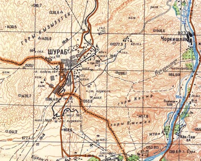 http://old.wikimapia.org/#lat=40.0272858&lon=70.5379987&z=16&l=1&m=s&v=9 — предполагаемая линия узкоколейной железной дороги вблизи Шураба (по другой версии — это железная дорога широкой колеи)