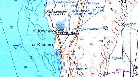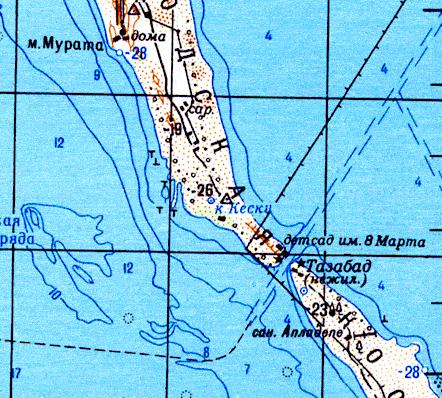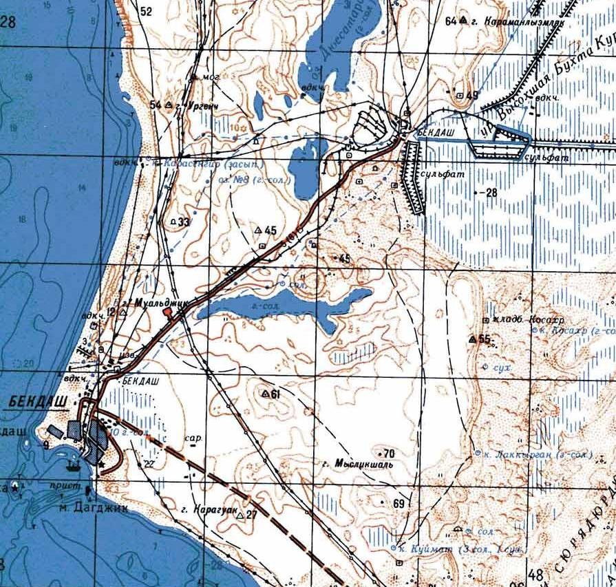 карте масштаба 1:200 000. На карте масштаба 1:200 000 (лист К-39-XXXV, издание 1987 года) показана короткая узкоколейная железная дорога вблизи «санатория Апладепе», расположенного на Красноводской косе. Или нечто отдалённо похожее на узкоколейную железную дорогу.
