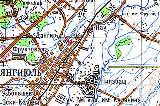 масштаба 1:200 000 (узкоколейные железные дороги не обозначены). Город Янгиабад был основан в 1940-х годах в связи с началом разработки месторождений урановой руды. В долине реки Дукентсай было создано несколько шахт (подземных рудников). В 1953 году Янгиабад получил статус города.