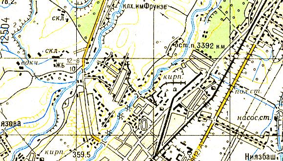 масштаба 1:200 000 (узкоколейные железные дороги не обозначены). Район местонахождения узкоколейных железных дорог в окрестностях Ангрена и Янгиабада на топографической карте масштаба 1:100 000 (узкоколейные железные дороги не обозначены)