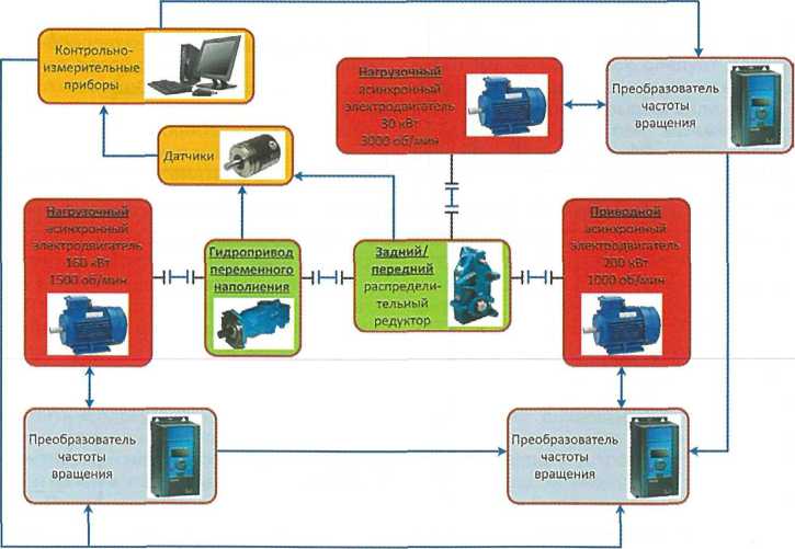Для передачи крутящего момента в качестве валопроводов используются карданные валы 4. Приводной электродвигатель и нагрузочные электродвигатели работают в паре с частотными преобразователями, которые позволяют передавать мощность с тормозных электродвигателей на приводной электродвигатель и таким образом осуществлять рекуперацию мощности.