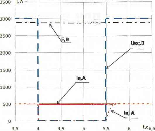 На рис. 3 приведены результаты моделирования электромагнитных процессов при прямом подключении накопителя к обмоткам возбуждения при параллельном соединении ТЭД и скорости движения 50 км/ч.