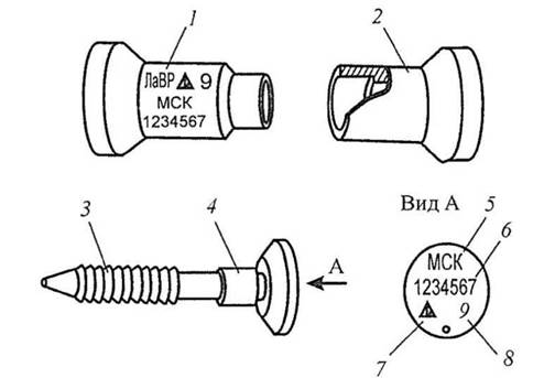 Рис. 1.9. ЗПУ «ЛаВР» в разомкнутом состоянии: 1 — корпус; 2 — колпачок; 3 — стержень; 4 — втулка; 5 — сокращенное буквенное наименование перевозчика; 6 — индивидуальный контрольный знак из семи цифр; 7 — товарный знак завода-изготовителя; 8 — последняя цифра года изготовления ЗПУ |