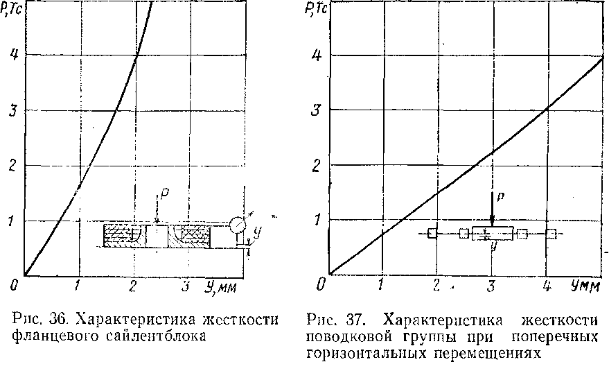 Жесткость одного цилиндрического сайлентблока," определенная экспериментально, меняется в зависимости от величины деформации резины от 12 ООО до 15 500 кгс/мм (рис. 34).