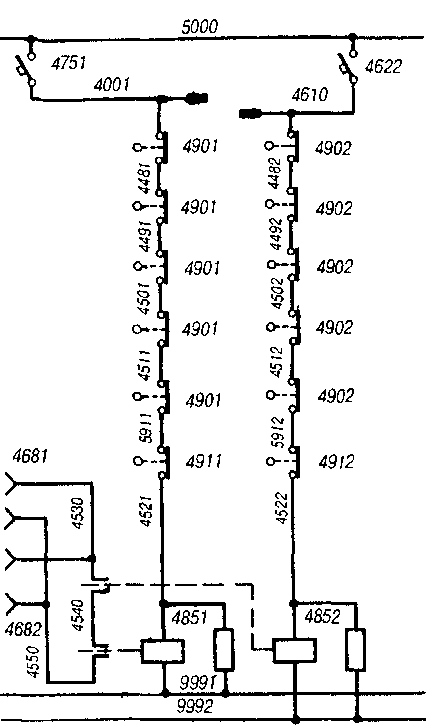 Подъем токоприемника возможен только при замкнутых контактах реле 4851 и 4852. Катушка реле 4851 получает питание по цепи: провод 5000, АЗВ 4751, провод 4001, ножи разъединителей 0761, 0771, 0781, провод 4141, блок-контакты щитов и дверей ВВК и люка для выхода на крышу 4901, провод 5911, контакты 4 — 6, замкнутые при выключенном блоке диагностики 8381, провод 4131, катушка реле 4851 Питание катушки реле 4852 происходит по аналогичной цепи от защитного выключателя 4622.