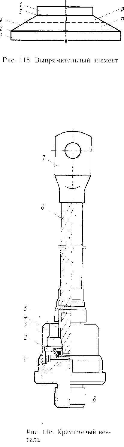 Боковую поверхность пластинки обрабатывают на конус (рис. 115) для увеличения длины поверхности между контактными шайбами, где будет приложено полное напряжение. В качестве электродов выпрямительного элемента используются никелированные вольфрамовые или молибденовые диски /, припаиваемые припоем 2 с двух сторон к кремниевой пластинке 3. Вольфрам и молибден имеют температурный коэффициент расширения почти такой же, как у кремния. Поэтому, при нагревании и охлаждении кремниевой пластинки ее размеры изменяются так же, как вольфрамовых (или молибденовых) дисков. Этим обеспечивается разгрузка кристалла от механических усилий, возникающих при нагревании вентиля в месте соединения выпрямительного элемента с основанием, изготовленным из меди, имеющей больший коэффициент линейного расширения. На рис. 116 представлена конструкция вентиля штыревого типа.