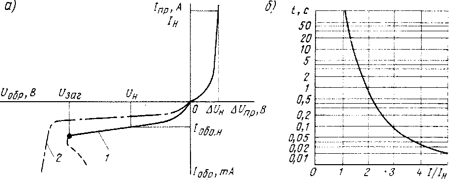 Рис. 119. Вольт-амперная характеристика вентиля (а) и его перегрузочная способность (б):