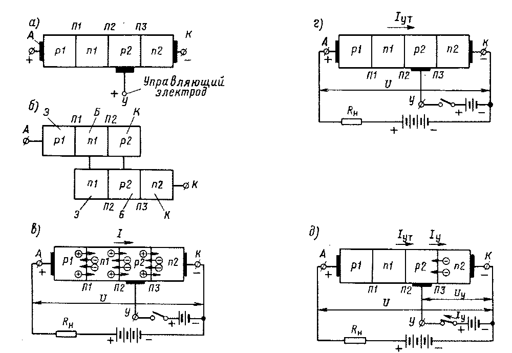 Рис. 121. Структурная схема (а) и физические процессы (б, в, г, д) в управляемом вентиле — тиристоре