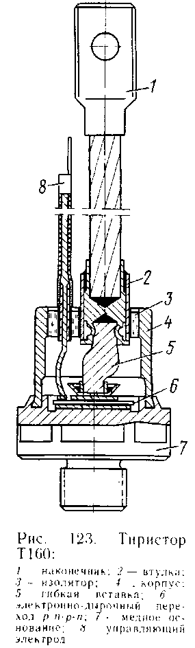 Управляемые вентили конструктивно сходны с неуправляемыми. Отличие их состоит в том, что они, кроме силового, имеют еще дополнительный вывод от управляющего электрода 8 (рис. 123). В мощных тиристорах общая толщина кремниевой пластинки не превышает 0,35 мм. Диаметр ее в зависимости от пропускаемого тока имеет различную величину.