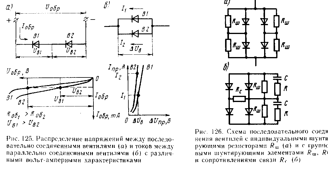 шом расхождении характеристик может даже превысить напряжение загиба и привести к выходу вентиля из строя. Для равномерного распределения обратного напряжения по последовательно соединенным вентилям каждый вентиль шунтируют резистором /сш (рис. 126, а ). Величина сопротивлений резисторов одинакова, поэтому они образуют делитель напряжения, который делит приложенное к вентилям обратное напряжение на равные части независимо от внутренних сопротивлений отдельных вентилей.