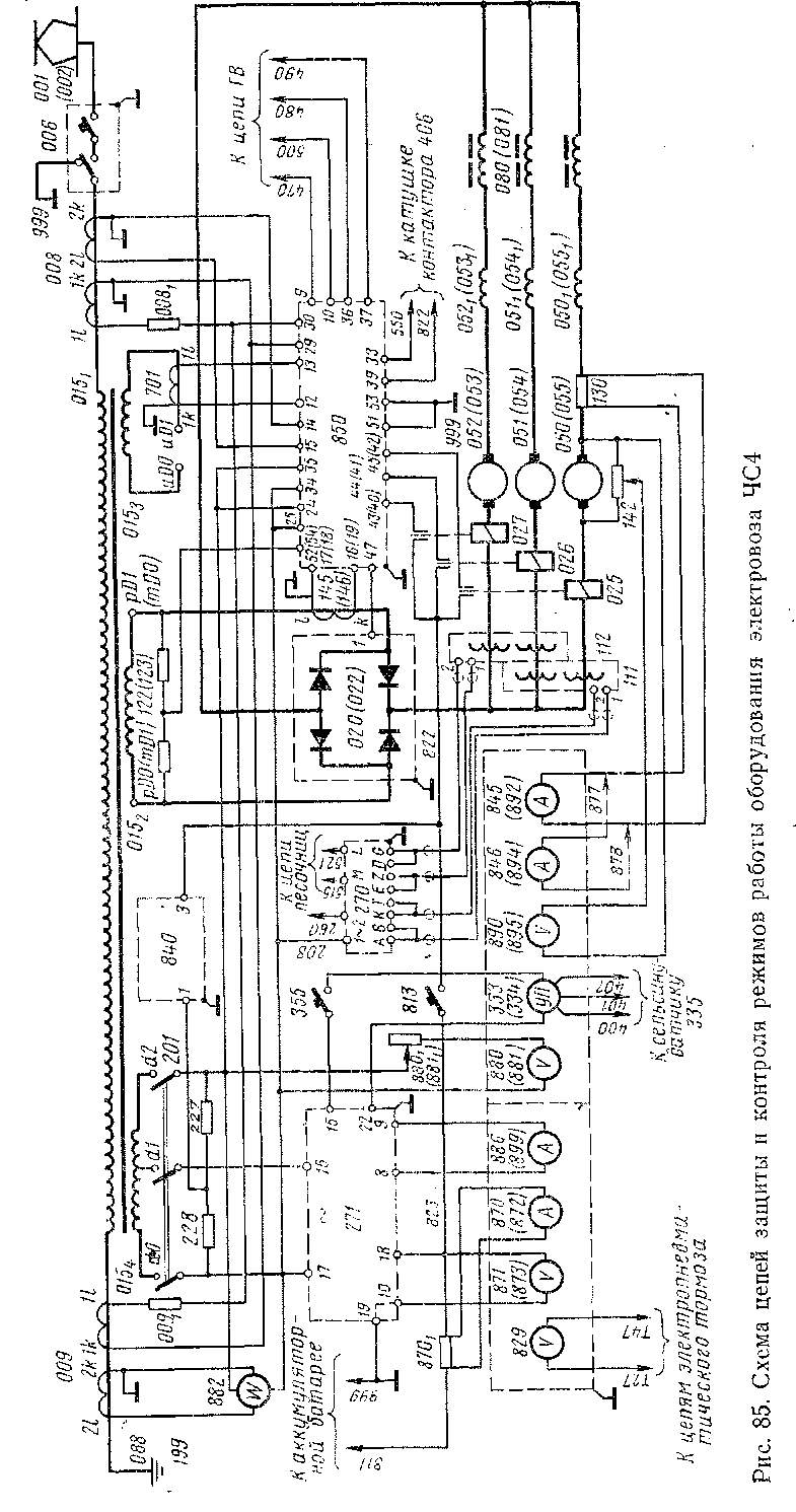 реле перегрузки [065 — 067] — в цепях реостатного тормоза (на рис. 85 не показаны, так как они установлены только на электровозах ЧС4Т).