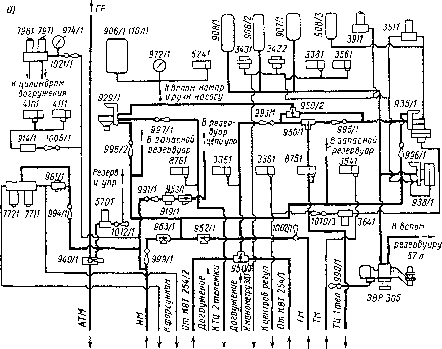 в) через разобщительный кран /02/, редукционный клапан 92/, вентили 797, 798 в цилиндры противоразгрузочного устройства 102511, 1025/2 (102513, 102514) Для контроля давления воздуха в цилиндрах установлен манометр 974 Редукционный клапан 921 регулируется на давление 540 кПа;