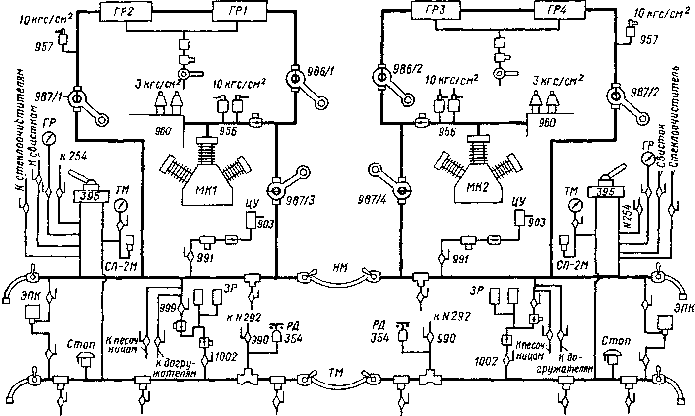 При работе мотор-компрессора 900 воздух через фильтры всасывается в цилиндры низкого давления, сжимается в них до давления 250 — 300 кПа, затем при обратном ходе поршней выталкивается в холодильник 901, из которого поступает в цилиндр высокого давления. Здесь он сжимается до давления 900 кПа и нагнетается через обратный клапан 951 и разобщительный кран 986 в два главных резервуара на каждой секции, соединенных попарно. На трубопроводе воздуха после 1-й ступени сжатия установлены предохранительный клапан 960, отрегулированный на давление 300 кПа, а также кран для спуска конденсата 1003/8 (10031/9). Такой же кран 1003/23 (1003124) предназначен для спуска конденсата из влагосборника 946 компрессора. Разобщительный кран