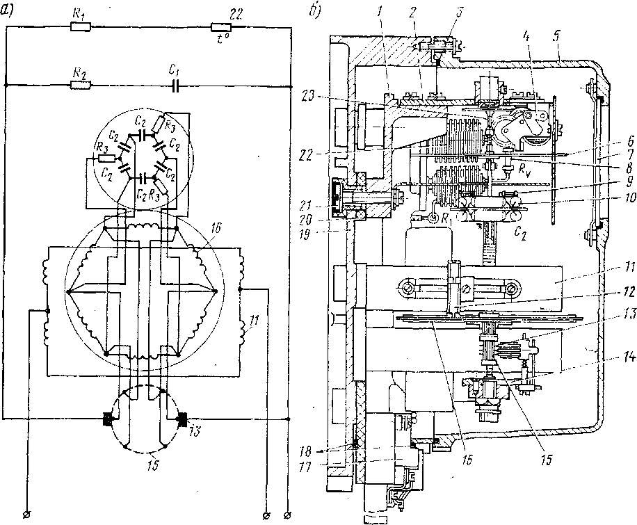 Рис. 189. Электрическая схема (а) и устройство (б) счетчика Д600М