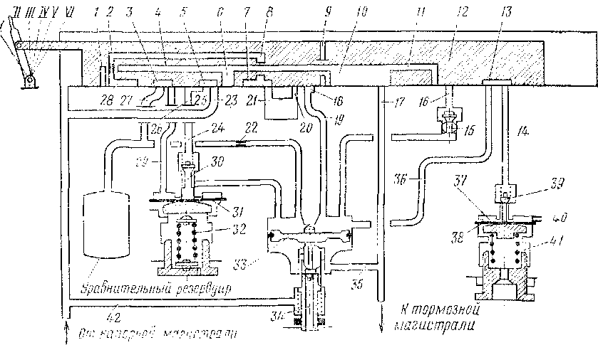 Одновременно выемка 3 соединяет каналы 27 и 29 и воздух проходит в полость над диафрагмой 31 редуктора. Как только давление в уравнительном резервуаре и над диафрагмой достигает величины, достаточной для преодоления усилия пружины 32, питательный клапан 30 закроется и прекратит доступ воздуха в уравнительный резервуар. Уравнительный поршень 33 под действием усилия установившегося давления в уравнительном резервуаре посредством клапана 34 будет автоматически устанавливать и поддерживать равное по величине давление в магистрали.