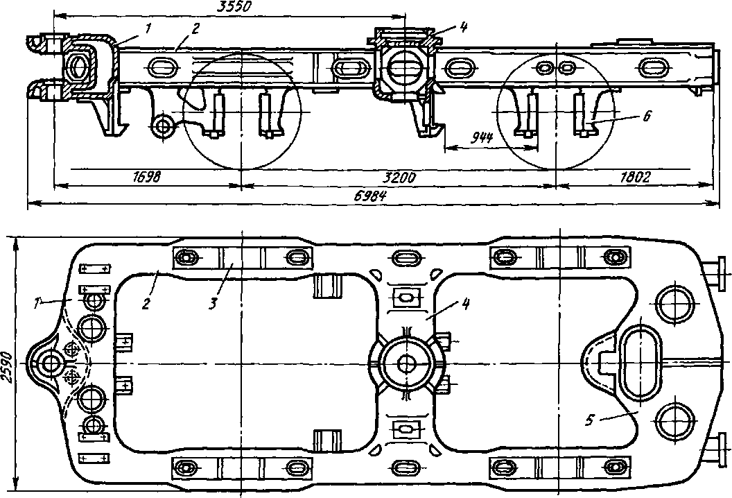 1 — брус сочленения, 2 — боковина; 3 — место для установки рессор, 4 — шкворневой брус; 5 — упряжной брус, 6 — направляющая стойка для буксы
