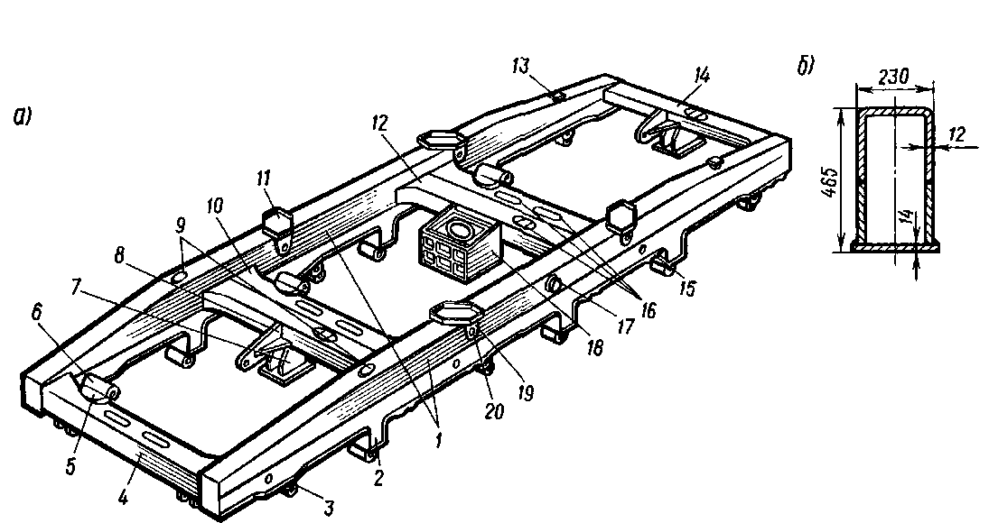 Составными элементами сварной рамы тележки электровозов ЧС4 м ЧС4 являются: боковины / (рис. 10) штампованно-сварные, шкворневой брус 12, поперечный брус 10, передняя 14 и задняя 4 концевые балки. Шкворневой брус расположен между первой, второй или пятой, шестой осями и представляет собой полую балку коробчатого сечения, сваренную из двух фасонных штампованных элементов. Верхняя часть коробки боковины имеет корытообразную форму, выполнена штамповкой из стального листа толщиной 12 мм. Нижняя часть коробки