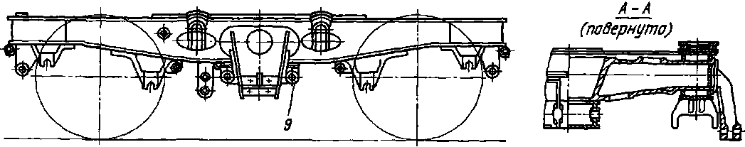 К боковинам приварены литые балки, с шарнирно закрепленными подвесками траверс тормозных башмаков и детали, поддерживающие рычажную передачу, опорные плиты для крепления тормозных цилиндров, кронштейны гидравличе-