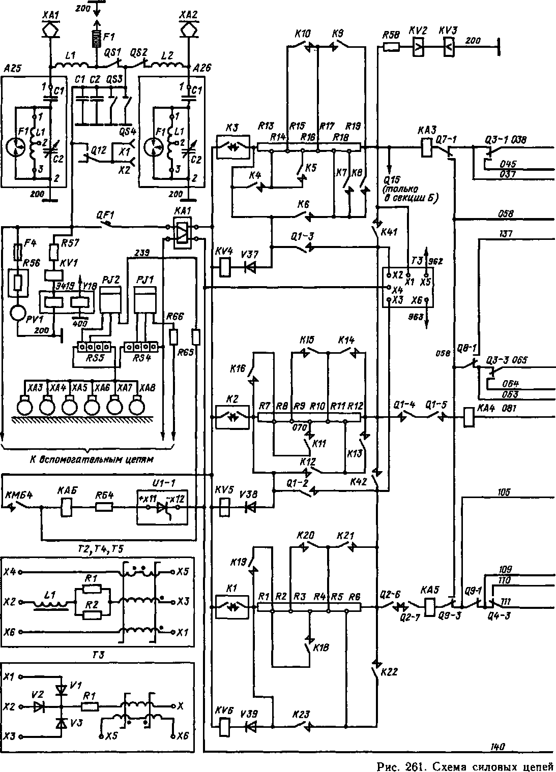 Это обеспечивается тем, что включение линейных контакторов К1, КЗ, К5 (см. рис. 260) поставлено в зависимость от срабатывания соответственно реле рекуперации КУ6, КУ5, КУ4. После того как они сработают, включаются линейные контакторы /С/, КЗ, К5 (рис. 263), и образуются цепи тока рекуперации.