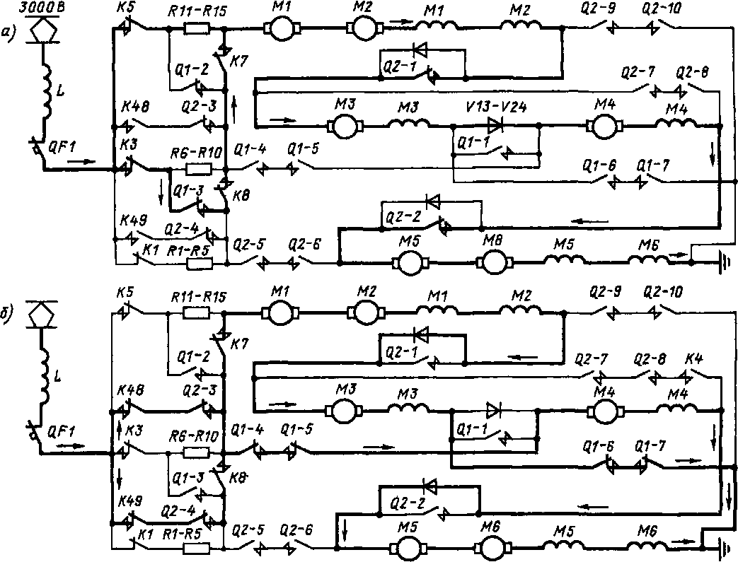 Рис 262. Схема прохождения тока при переключении тяговых двигателей М1—Мб с соединения С на СП—П (а) и с соединения СП—П на П (б)