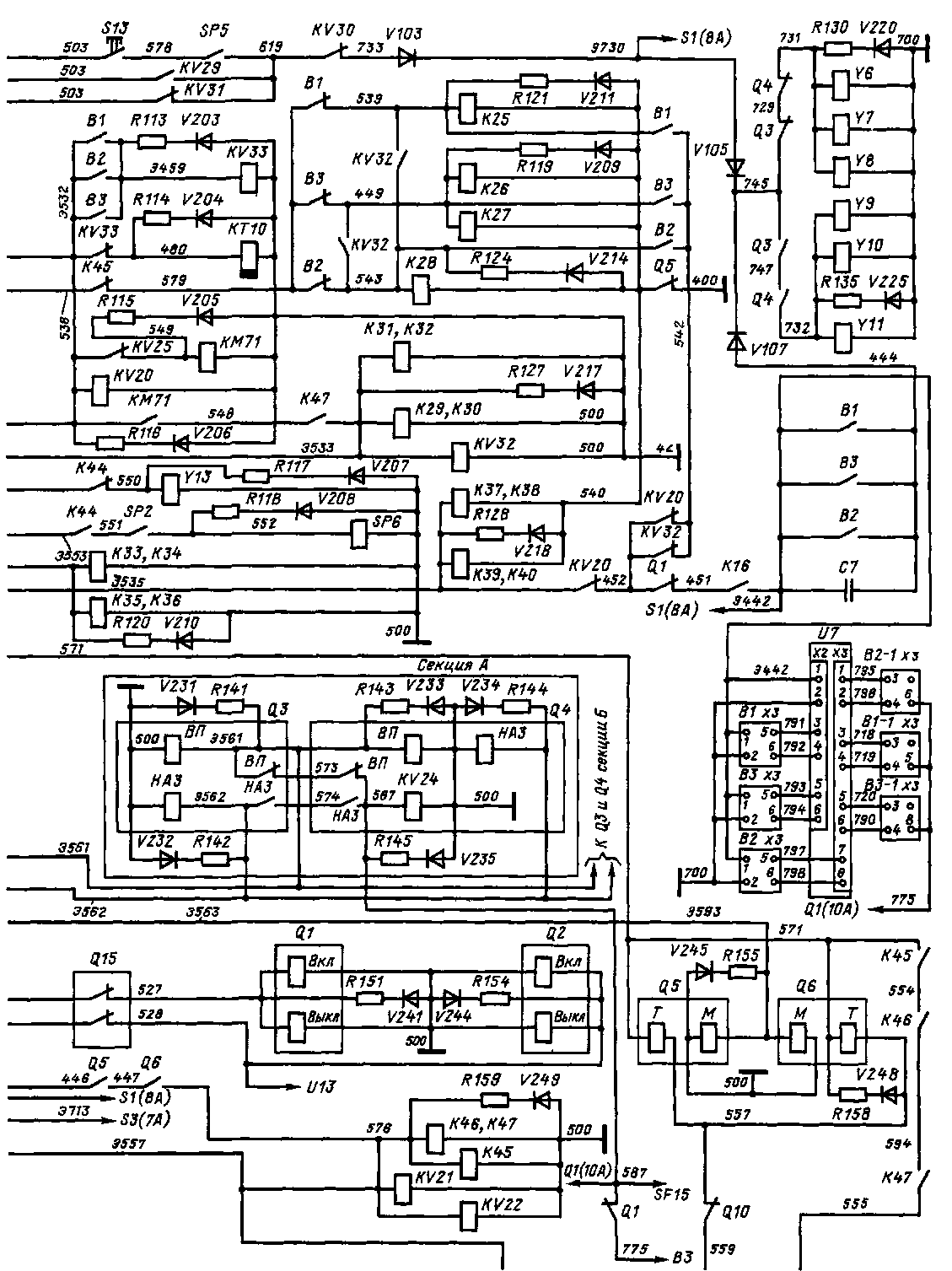 На соединении СП включаются контакторы КЗ и К5. При этом от провода Э564 по цепи: размыкающий контакт Q2, провод 591, замыкающий контакт линейных контакторов КЗ и К5 напряжение подается к катушкам реостатных контакторов К17, К18 и К12, К13. На соединении С включается линейный контактор К1 и через провода Э582, Э534, контакт Q5, размыкающий контакт группового переключателя Q1, провод 591, замыкающий контакт К1, провод 681 напряжение подается к катушкам реостатных контакторов К22, К23, а от провода 681 через размыкающие контакты Q1 по проводам 639, 680 — соответственно к катушкам реостатных контакторов Kt2, КІЗ и К17, К18.