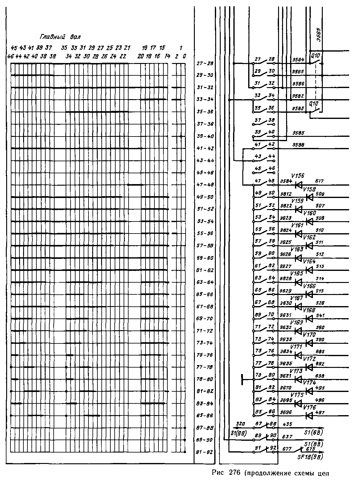 Тяговый режим. Для приведения электровоза в движение необходимо вставить ключ в специальное гнездо устройства тормозов SQ2 (рис. 276) и включать выключатель управления S21 в кабине машиниста, из которой производится управление. Затем реверсивно-селек-тивную рукоятку контроллера машиниста устанавливают в положение M в соответствии с выбранным направлением движения (например, Вперед). В этом положении от провода Э301 через контакт выключателя управления S21, провод 501, автомат SF1, замыкающий контакт SQ2, размыкающий контакт KV21, электропневматический клапан V14, контакты 1-2 {3-4) реверсивно-селективного вала контроллера машиниста SM напряжение подается на катушки вентилей реверсоров Q3 и Q4. Валы реверсоров устанавливаются в положение, соответствующее выбранному направлению движения, и замыкаются контакты цепей управления реверсоров. Эти контакты подают напряжение на катушку промежуточного реле KV24 и провод Э563 (от провода 501). От провода Э563 напряжение подается на катушки M вентилей тормозных переключателей Q5 и Q6, валы которых занимают положение M (моторное) .