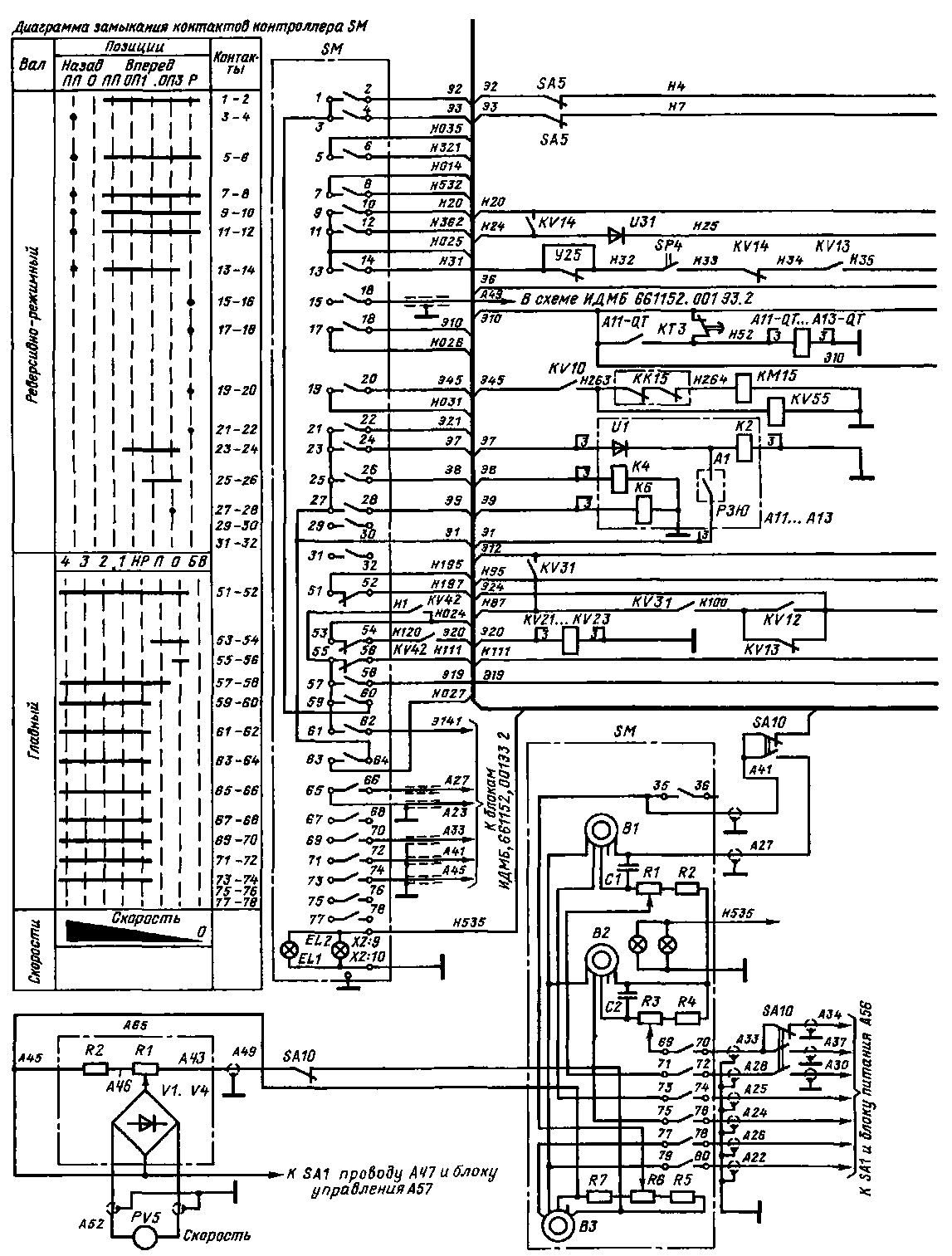 подается напряжение 50 В постоянного тока на блок автоматического управления А55 для обеспечения питания катушек контакторов ослабления возбуждения в зоне 4 регулирования. Напряжение подается по цепи: контакты 61—62 контроллера, провод Э/, контакты SAW, провод Н630;