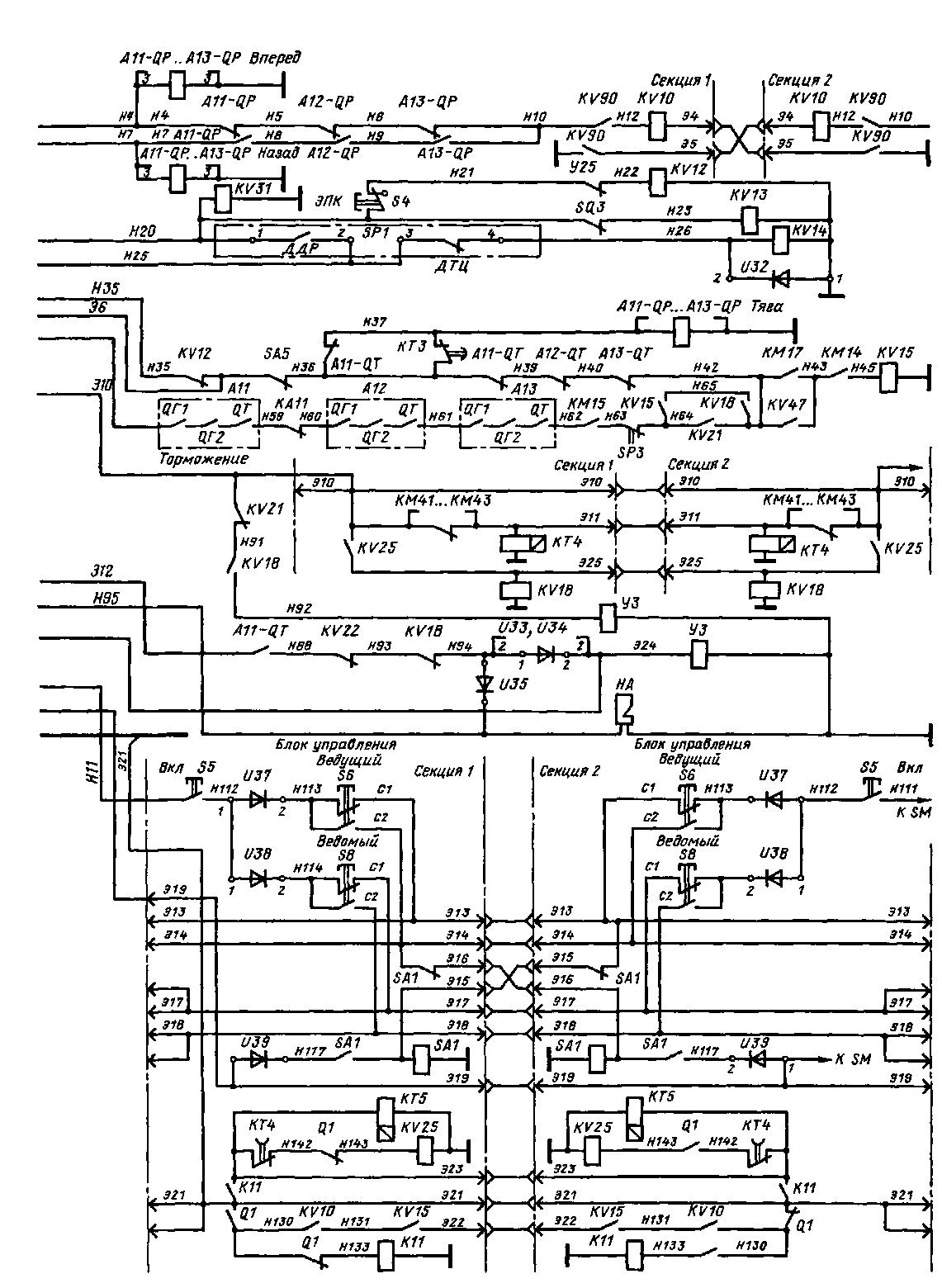 Контактами реле KV91 в проводах А131, А136 и А132, А137 выходы блоков измерения А59, А60 ведущего электровоза подключаются к блокам автоматического управления А55 ведущего и ведомого электровозов. Напряжением с выходов пропорционально току якорей тяговых двигателей ведущего электровоза и для ведомого электровоза задается ток якоря. Контактами реле KV91 в проводах А75, А76 на ведущем электровозе размыкается цепь питания реле в блоке А55, которое в обесточенном состоянии подключает регулятор тока якоря к выходу сельсина В2 и отключает от выхода блоков А59, А60 ведомого электровоза. На ведомом электровозе цепь питания реле в блоке А55 замыкается и, возбудившись, реле отключает регулятор тока якоря от выхода сельсина В2 и подключает к выходу блоков А59, А60 ведущего электровоза, которые при этом становятся задатчика-ми тока якоря для ведомого электровоза. Контакты реле KV91 предназначены для разрыва цепи реле токовой защиты, после ее срабатывания, при установке штурвала контроллера в положение 0.