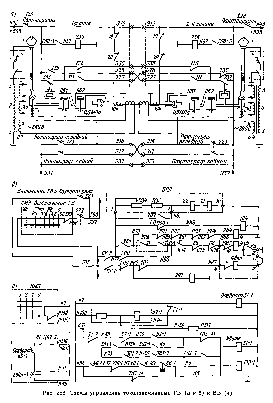 Рассмотрим ряд примеров. Схемы цепей управления токоприемниками во многом зависят от типа их клапанов (импульсные, неимпульсные), пневматической схемы питания сжатым воздухом приводов токоприемников и блокировок безопасности, которые обеспечивают защиту локомотивных бригад от попадания под высокое напряжение.