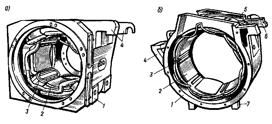 Рис 79 Остовы тягових двигателей УРТ-110А (а) и 2АЬ-4846еТ (б) с полюсами для рамного подвешивания'