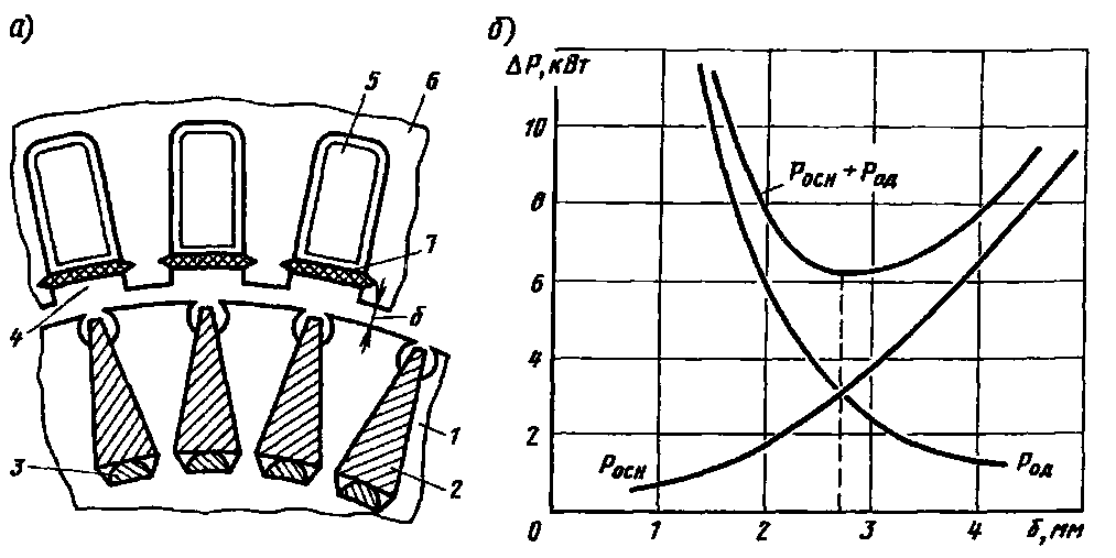 Рис. 106 Расположение надпазовых каналов у тягового асинхронного двигателя (а) и кривые