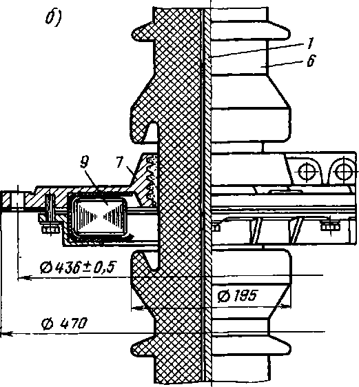 Некоторые конструктивные особенности имеют трансформаторы тока ТК-20, ТК-40 для питания токовых обмоток счетчиков электроэнергии отечественных электровозов переменного тока. Первичная обмотка трансформатора (рис. 128) выполнена в виде шины 1, проходящей через тороидальный шихтованный сердечник 9 и изоляционную стойку 6 с накладкой 5. Катушка 8, являющаяся вторичной обмоткой, и сердечник 9 удерживаются дисками 3 и 4, которые стянуты шпильками 2 и 10 и планкой 7. На трансформаторе ТК-40 сердечник с катушкой укреплен на стальном фланце.
