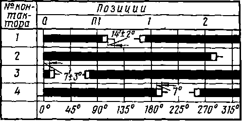 Конфигурация кулачков, относительное расположение их на валу, взаимодействие с приводом и контакторами в целом задаются диаграммой замыкания контакторов. На диаграмме показано, какие контакторы должны быть замкнуты и какие разомкнуты на каждой позиции аппарата, а также последовательность замыкания и размыкания контакторов при переходе с одной позиции на другую. Обычно на таких диаграммах черные полосы соответствуют положениям вала, на которых данные контакторы полностью замкнуты (рис. 173), белые концы у этих полос — углам поворота вала, в пределах которых происходит притирание контактов, толстые линии — периоду перемещения подвижных контактов до соприкосновения с неподвижными, отсутствие полос и линий — положению полного выключения контактов. Вертикальными линиями отмечены позиции, фиксируемые приводом. Диаграммы используют также для проверки правильности сборки группового аппарата и допустимости износа его частей в эксплуатации.