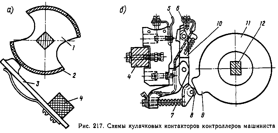 В кулачковых контроллерах (рис. 217, б) замыкание и размыкание цепей проводов управления осуществляют кулачковые контакторы (контакторные элементы), укрепленные на стойке 4, на которые воздействуют кулачковые шайбы //.
