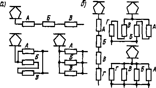 Для последовательно-параллельного соединения, как и для рассмотренного случая, необходимо соединить пусковые реостаты в две параллельные цепи. Сопротивление первой позиции параллельного соединения можно получить при полном использовании всего реостата г[, подразделив его на три группы по '/3 г\ и включив их параллельно. Чтобы получить все три комбинации, реостат необходимо разделить на четыре группы с сопротивлениями '/зг1. '/згь 1ьТ'\ и У6г, в каждой. Для последовательного соединения все эти группы должны быть включены последовательно, для последовательно-параллельного — в две параллельные цепи с г" = г\/\п для параллельного — в три параллельные цепи с г'{'= г\/9.