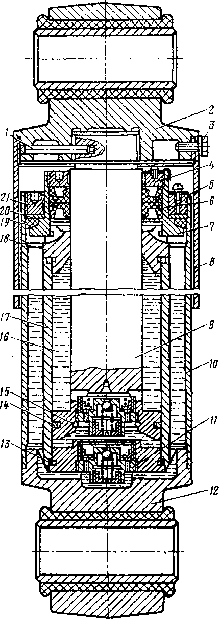 Гаситель состоит из двух основных частей. В нижнюю часть (рис. 21) входят рабочий цилиндр и запасной резервуар. Вверху имеются сальник и головка рабочего цилиндра, внизу -■- клапанное устройство, служащее дном цилиндра (аналогичные клапаны расположены в поршне). Верхняя часть — это шток с поршнем и кожух.