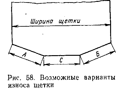 На электропоездах при частом изменении направления вращения якоря тягового двигателя иногда контакт щетки с коллекторными пластинами осуществляется только на участках А и Б (рис. 58), а участок С может вообще не контактировать с коллекторными пластинами. Сокращение контактной поверхности повышает нажатие щеток на коллекторные пластины, это может вызвать преждевременный износ щеток, их скалывание и выкрашивание, что приведет к ухудшению токосъема. На работу щеток влияет также температура окружающего воздуха. Например, в зимнее время года, чтобы щетки не примерзали к щеткодержателю, их необходимо просушивать, кроме того, следует увеличивать нажатие щеток.