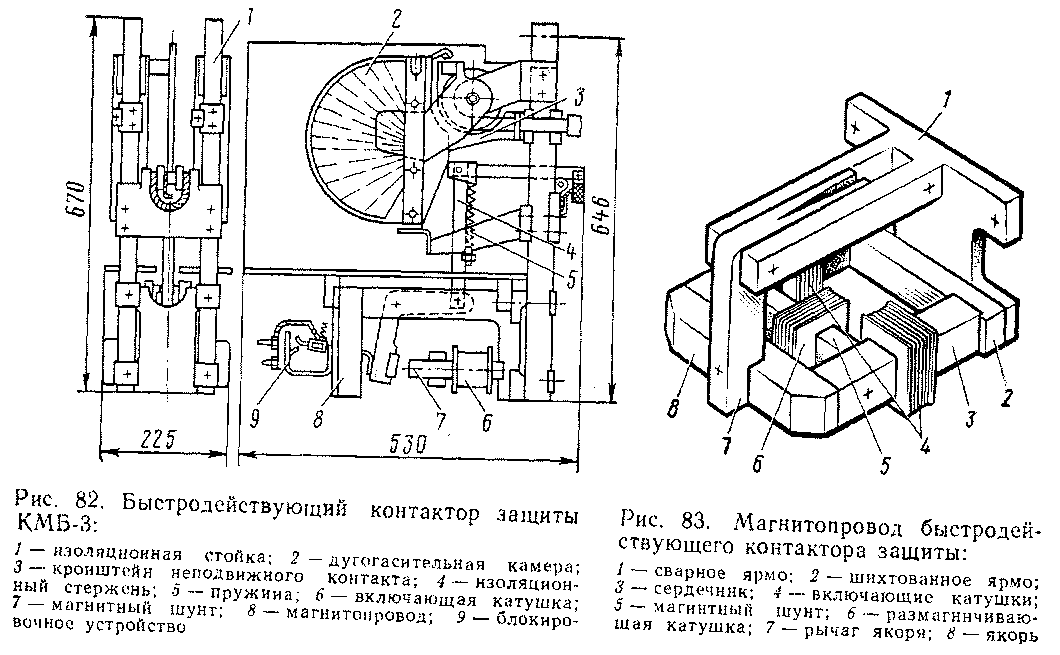 Быстродействующий контактор защиты КМБ-3 (рис. 82) служит для защиты силовой цепи тяговых двигателей от токов к.з., возникающих в генераторном режиме (при электрическом торможении). Его применяют на электропоезде ЭР2Р.